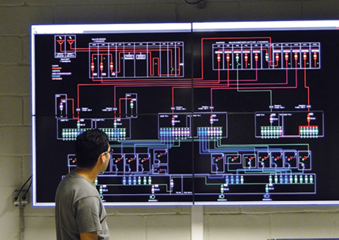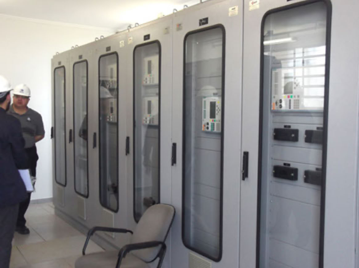 Fotos: Sala do Sistema de Supervisão e Controle, Video wall do Sistema de Supervisão e Controle, Painéis de média tensão, Cubículo de entrada da concessionária, Operador da Mantest no cubículo de entrada da concessionária.